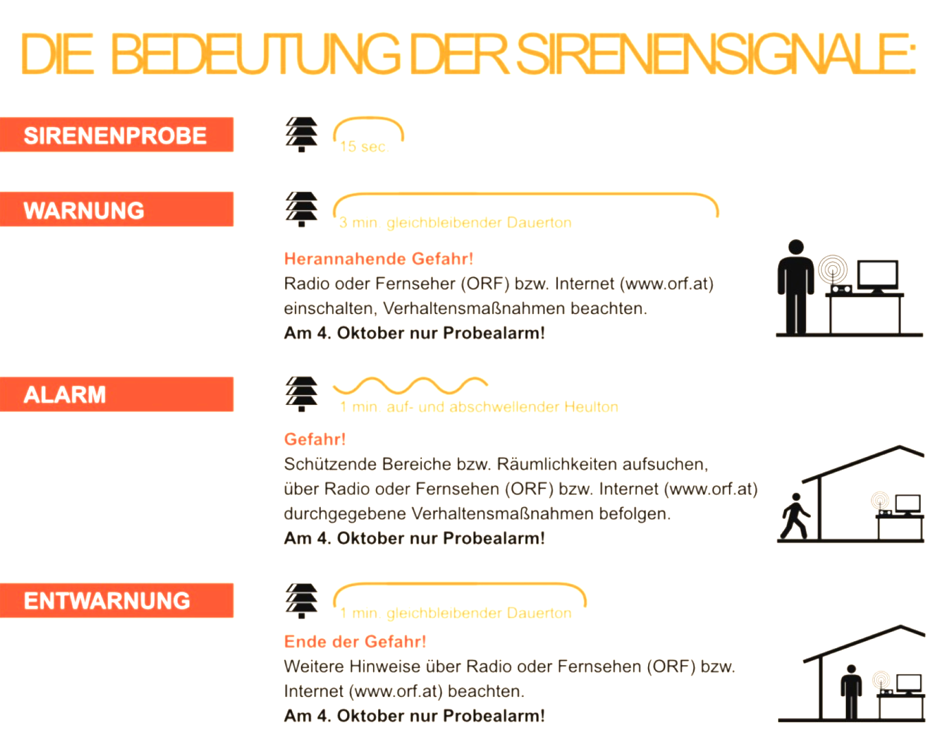 Zwischen 12 Uhr und 12.45 Uhr werden nach dem Signal „Sirenenprobe“ die drei Zivilschutzsignale „Warnung“, „Alarm“ und „Entwarnung“ in ganz Österreich ausgestrahlt. Der Probealarm dient einerseits zur Überprüfung der technischen Einrichtungen des Warn- und Alarmsystems, andererseits soll die Bevölkerung mit diesen Signalen und ihrer Bedeutung vertraut gemacht werden.