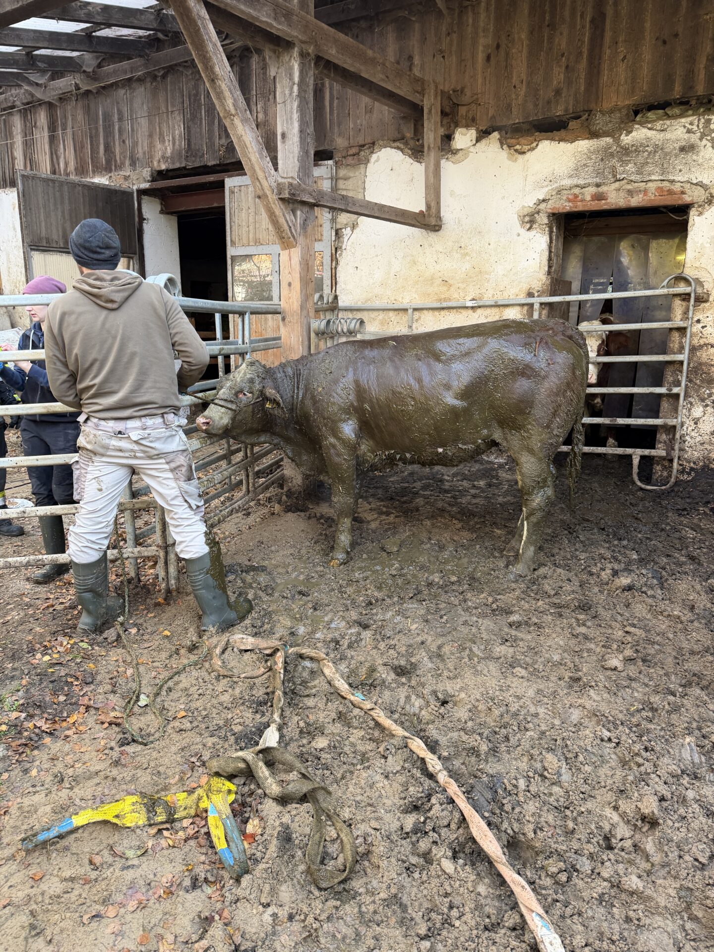 Nach rund zwei Stunden intensiver Arbeit war die Rettung erfolgreich abgeschlossen – das Kalb konnte dem anwesenden Tierarzt übergeben werden. Der Einsatz endete um 10:00 Uhr.