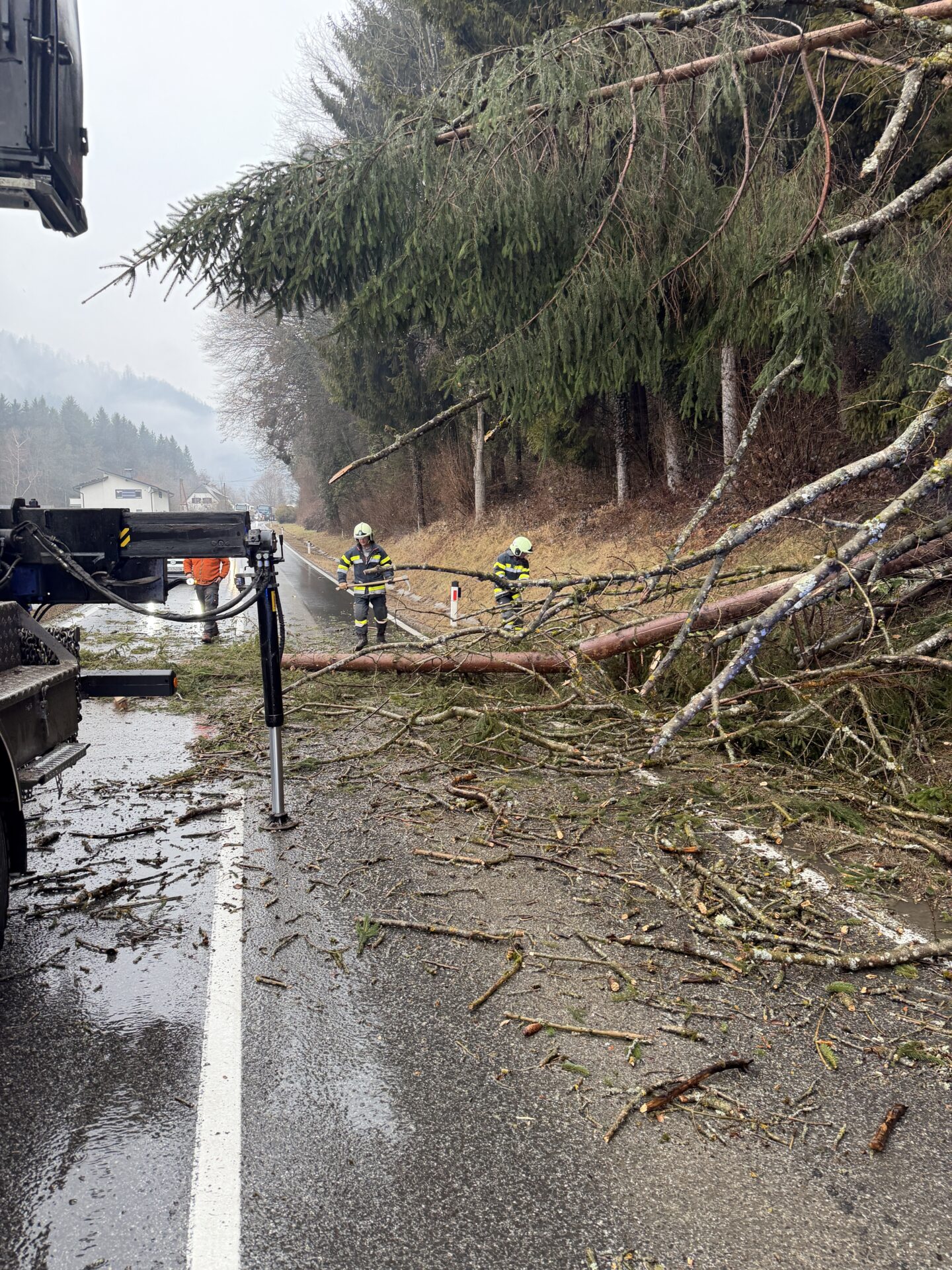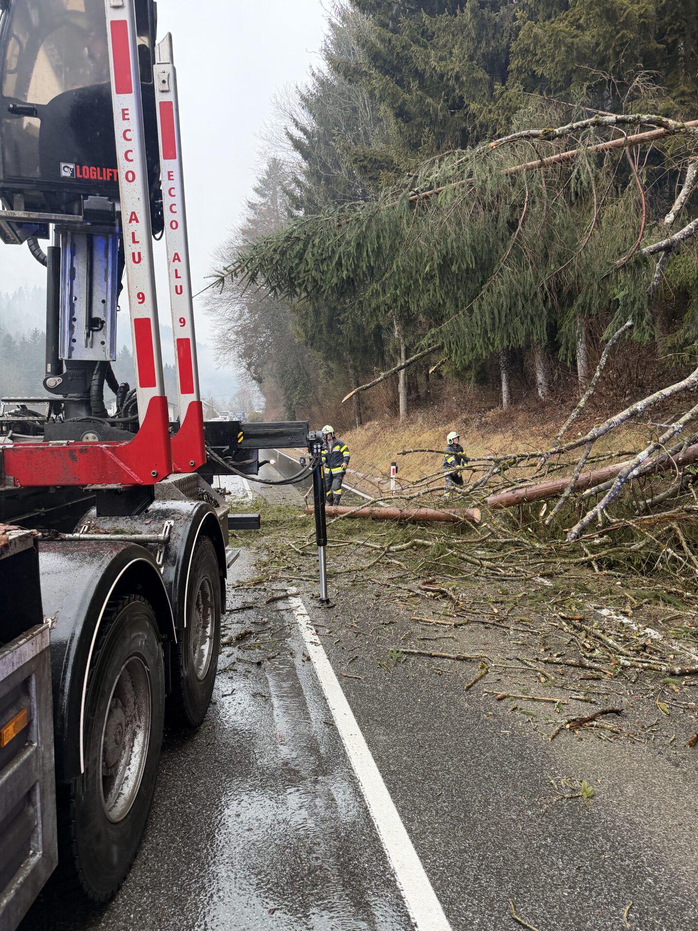 Der Einsatzleiter organisierte die Unterstützung eines im Stau stehenden Holztransporters. Mithilfe dessen Kran konnten die von der Feuerwehr geschnittenen Bäume rasch von der Fahrbahn entfernt werden. Dadurch war eine zügige Räumung der Straße möglich.